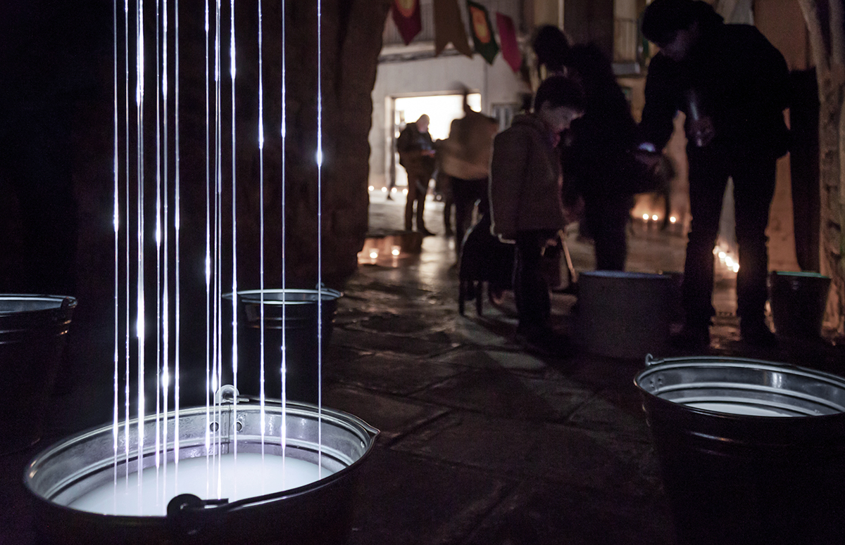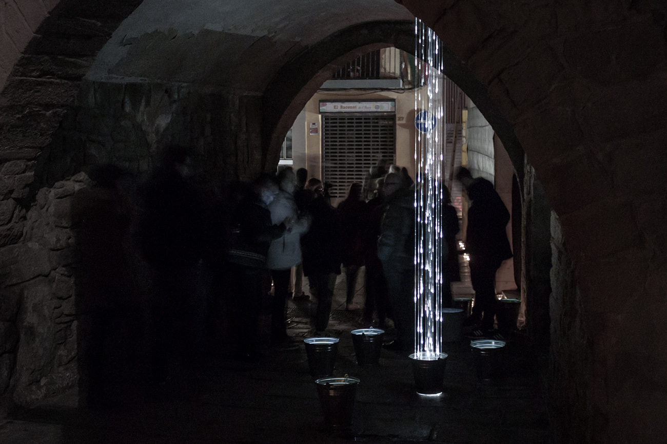 Mullalallum es una instalación efímera de luz en el casco antiguo de Manresa, en un paso cubierto próximo a la Iglesia del Carme. Recreando el efecto de una gotera milagrosa, una serie de baldes recogen la filtración que brota de la bóveda, fundiendo agua y luz en un único elemento.